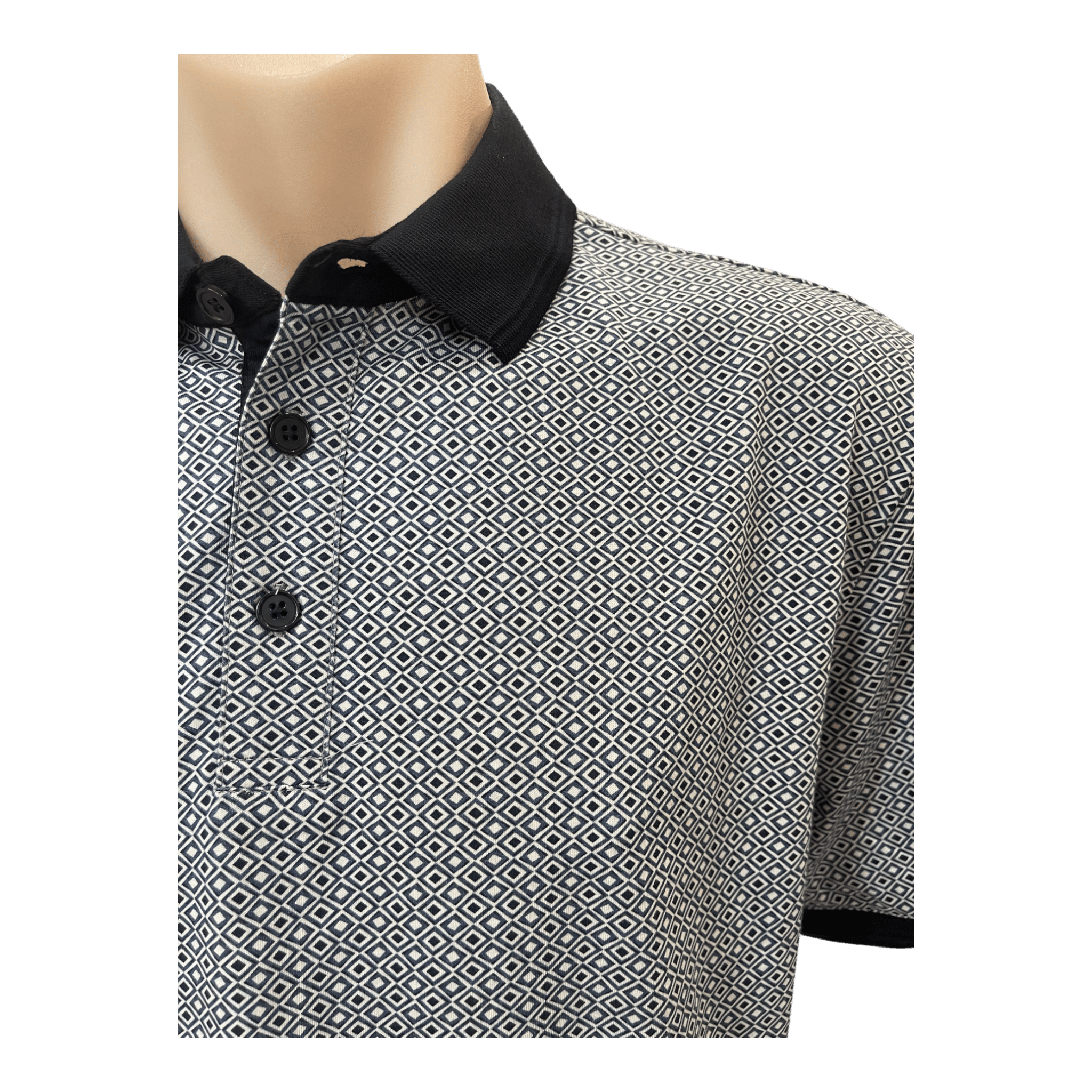 The diamond print pattern adds a touch of sophistication, making it suitable for both casual outings and more formal occasions. The classic polo collar and three-button placket provide a timeless look, while the tailored fit flatters all body types. Available in a range of versatile colors, this polo can easily be paired with your favorite jeans, shorts, or chinos for a stylish ensemble.